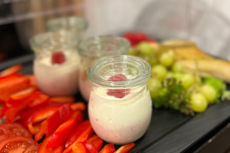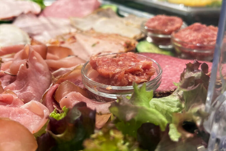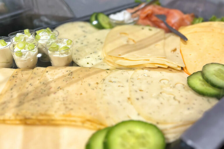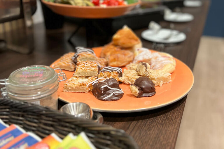 Mit Brötchen, Brot, Konfitüren, Aufschnitt- und Käsespezialitäten aus eigener Fleischerei, Rührei, gekochten Eiern, Müsli, Cornflakes, Joghurt, Quark, Antipasti, frischem Gemüse, Kuchen, Gebäck, Wasser, Milch, Säften & unbegrenzten Heißgetränken sowie Kaffeespezialitäten von Barista Rebel.
